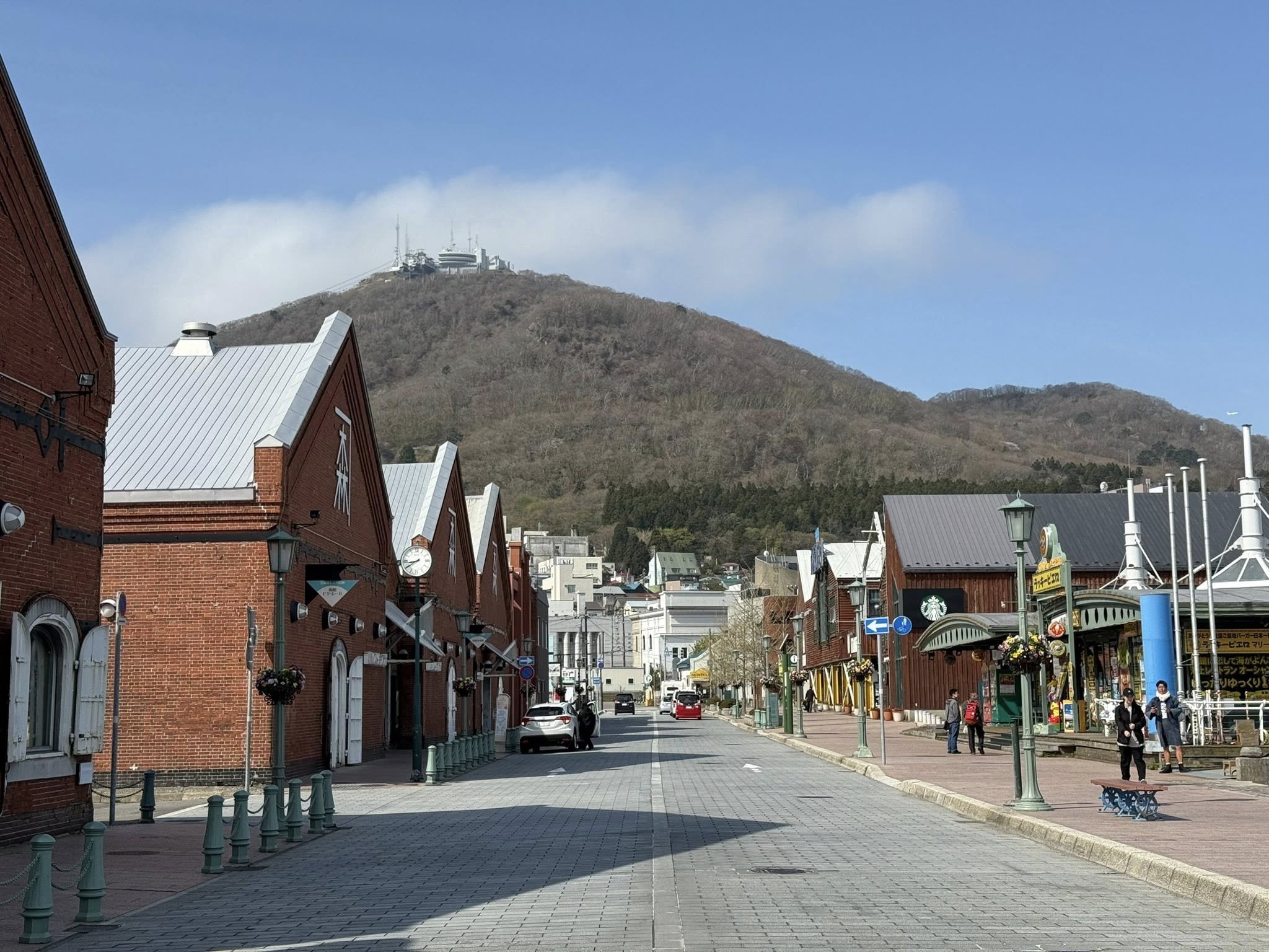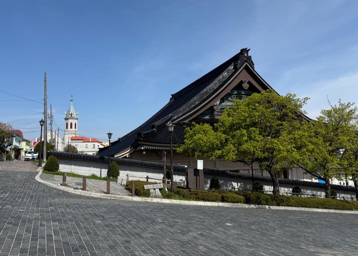 Sorakoznak a 120 éves épületek. Fent a hegyen a kilátó, ahol az előző nap voltam. Miután – az amerikai fenyegetést követően – Hakodate az 1850-es években megnyílt a külkereskedelem előtt, sok amerikai, brit, orosz, kínai kereskedő telepedett le itt.