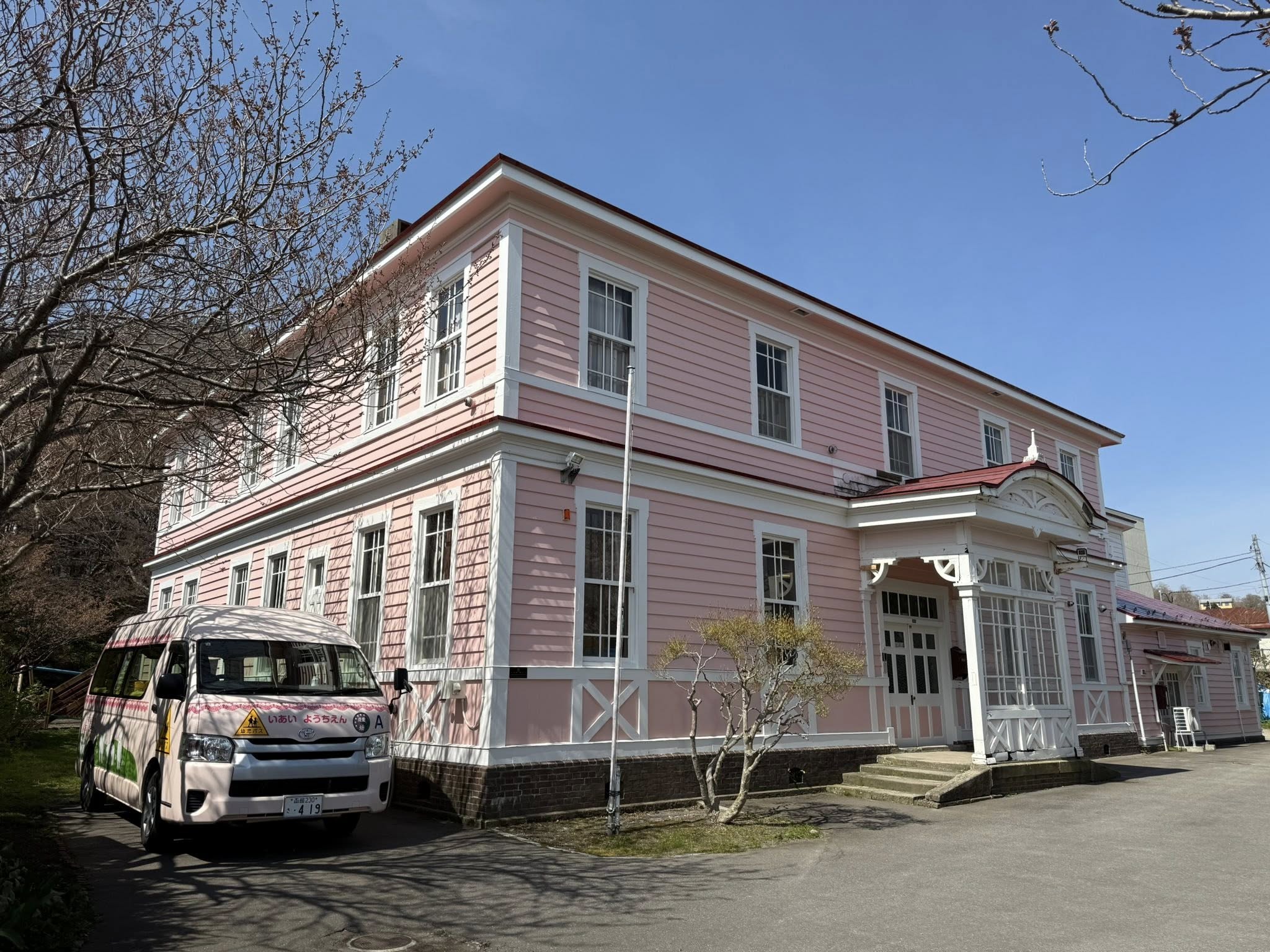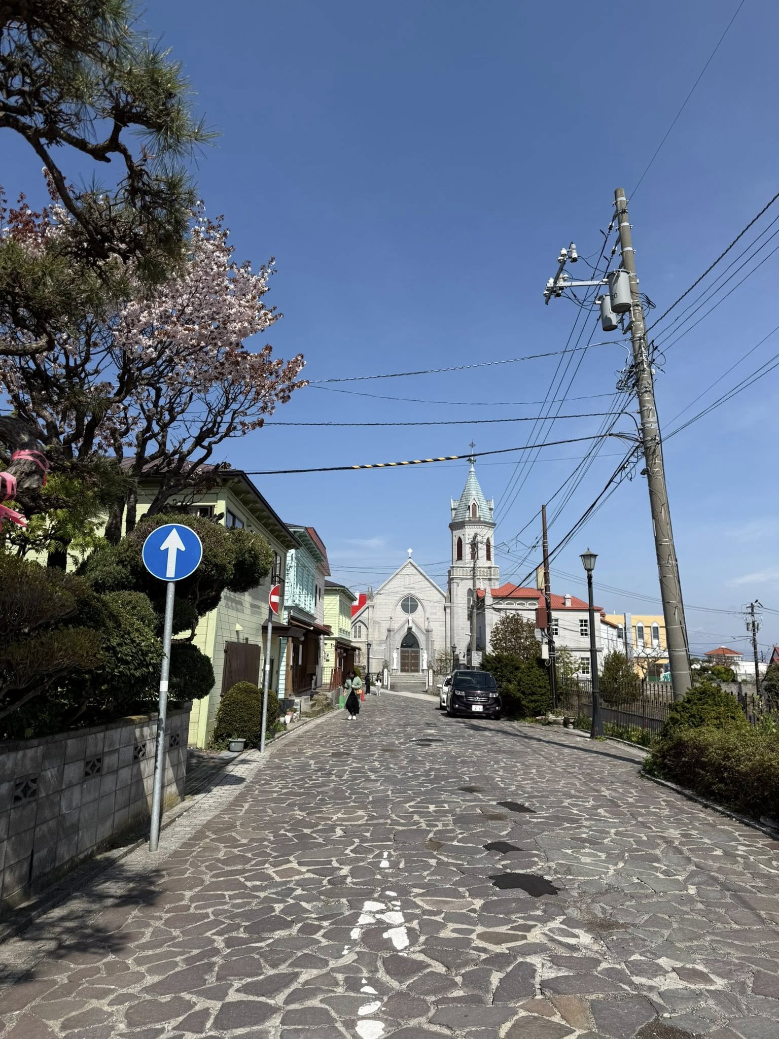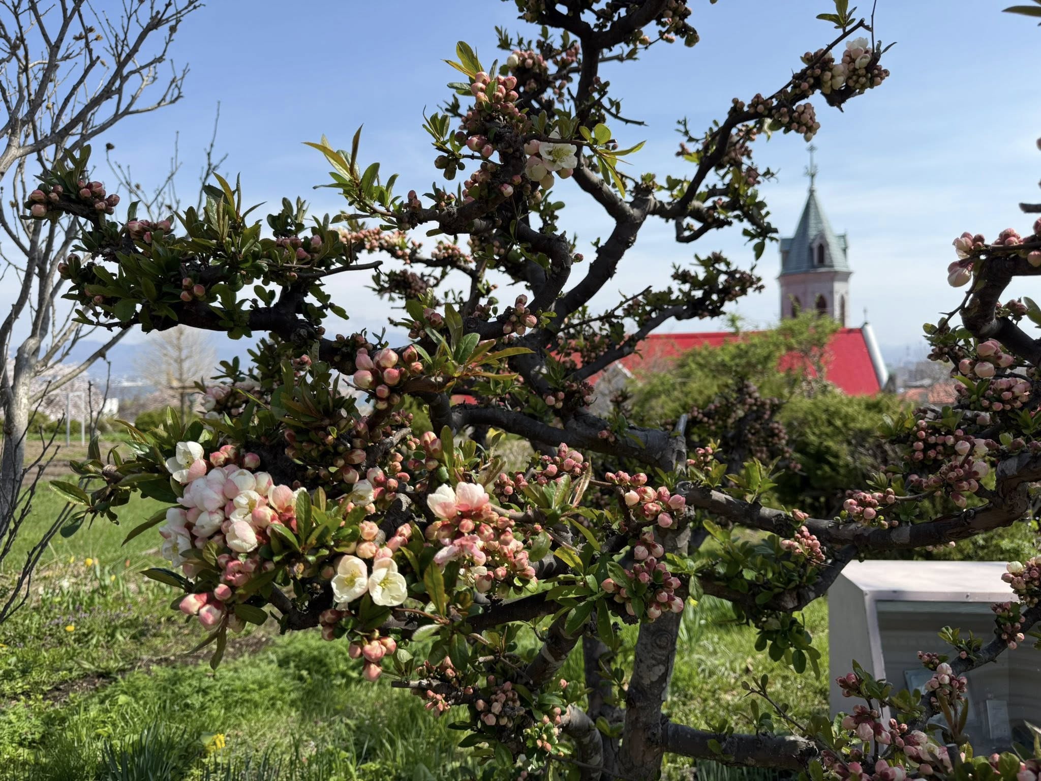 Hakodate katolikus temploma virágzó cseresznyefával.