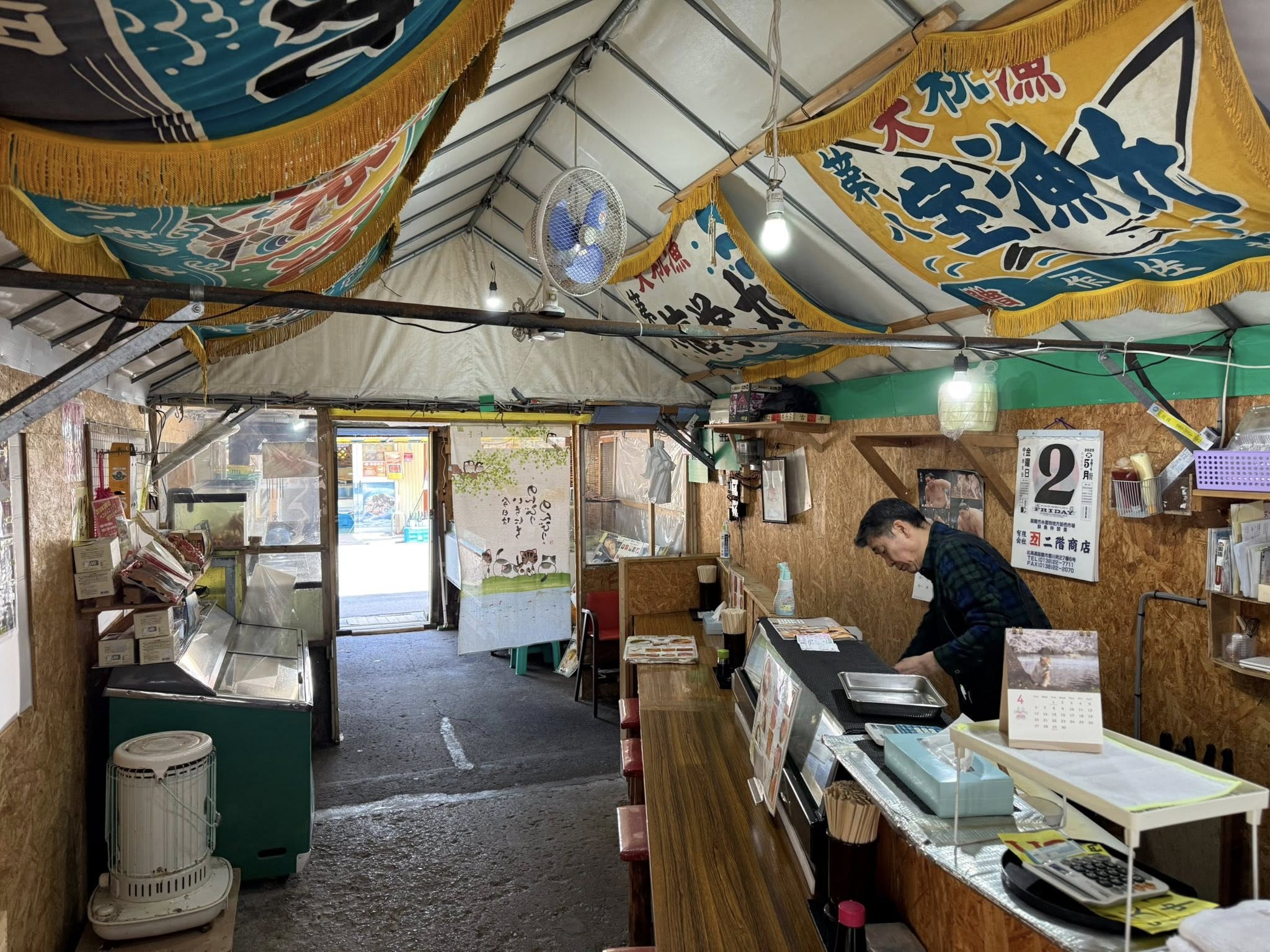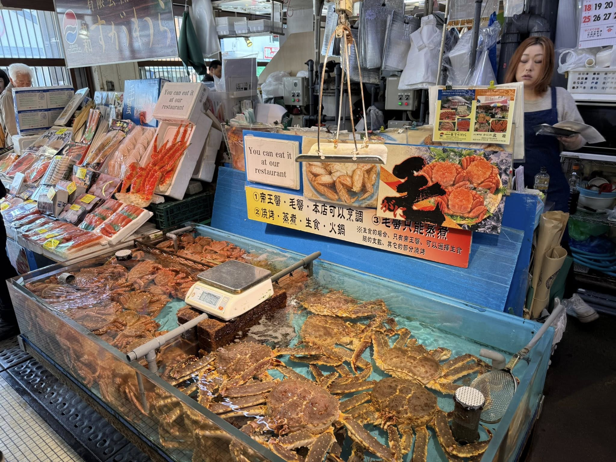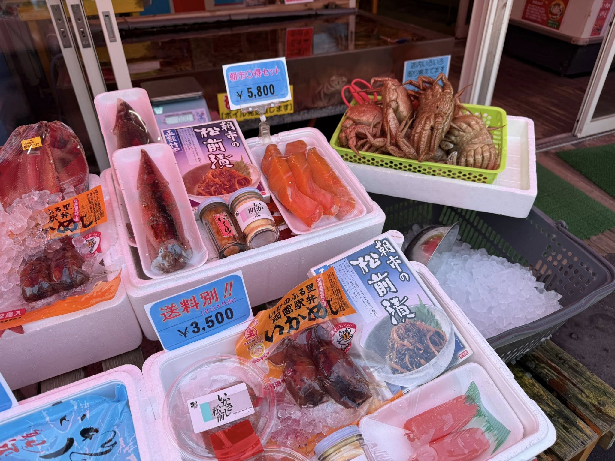 Hakodate reggeli piaca. Sok tengeri élőlény maradványával.